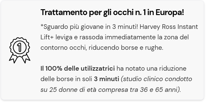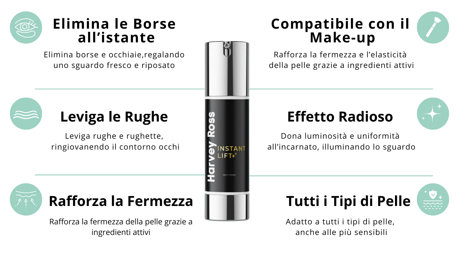 "Con l’età, la pelle del contorno occhi si assottiglia e perde tonicità, favorendo la comparsa di rughe e borse. Instant Lift+ di Harvey Ross offre un’azione mirata per rassodare, levigare e ridare freschezza a questa zona delicata. La sua formula avanzata contribuisce a ripristinare la fermezza e la elasticità cutanea, per uno sguardo visibilmente più luminoso e riposato."